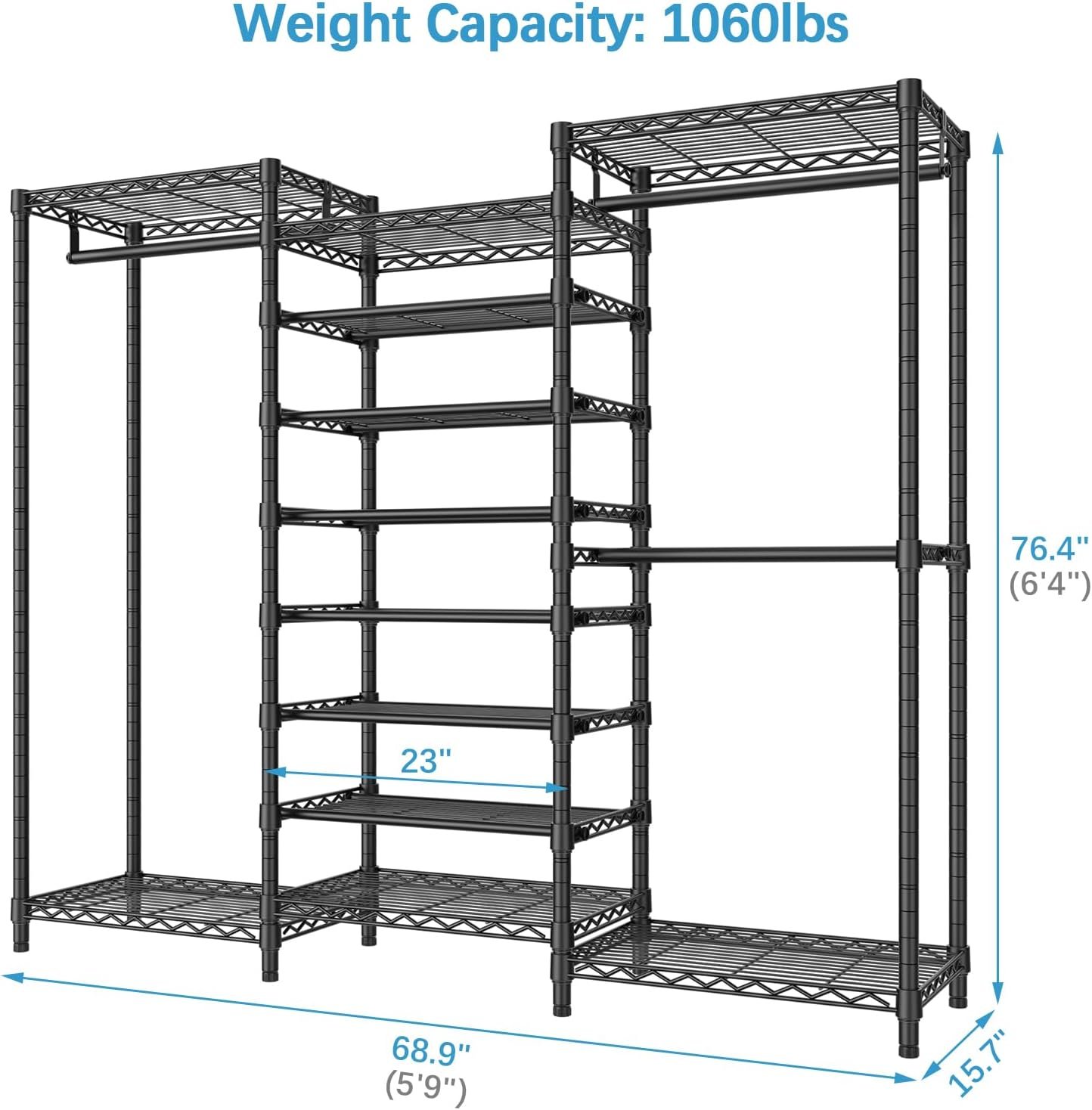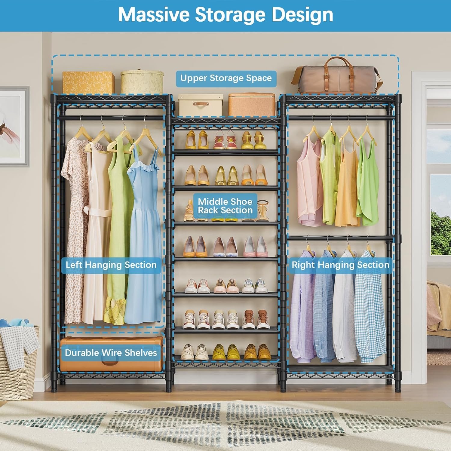 CUSTOMIZABLE STORAGE: Our garment rack features 6 adjustable wire shelves and 6 adjustable shoe racks, giving you the flexibility to store a wide variety of items, from shoes and bags to luggage and folded clothing. You can also remove a piece of shoe rack to create additional space for boots.