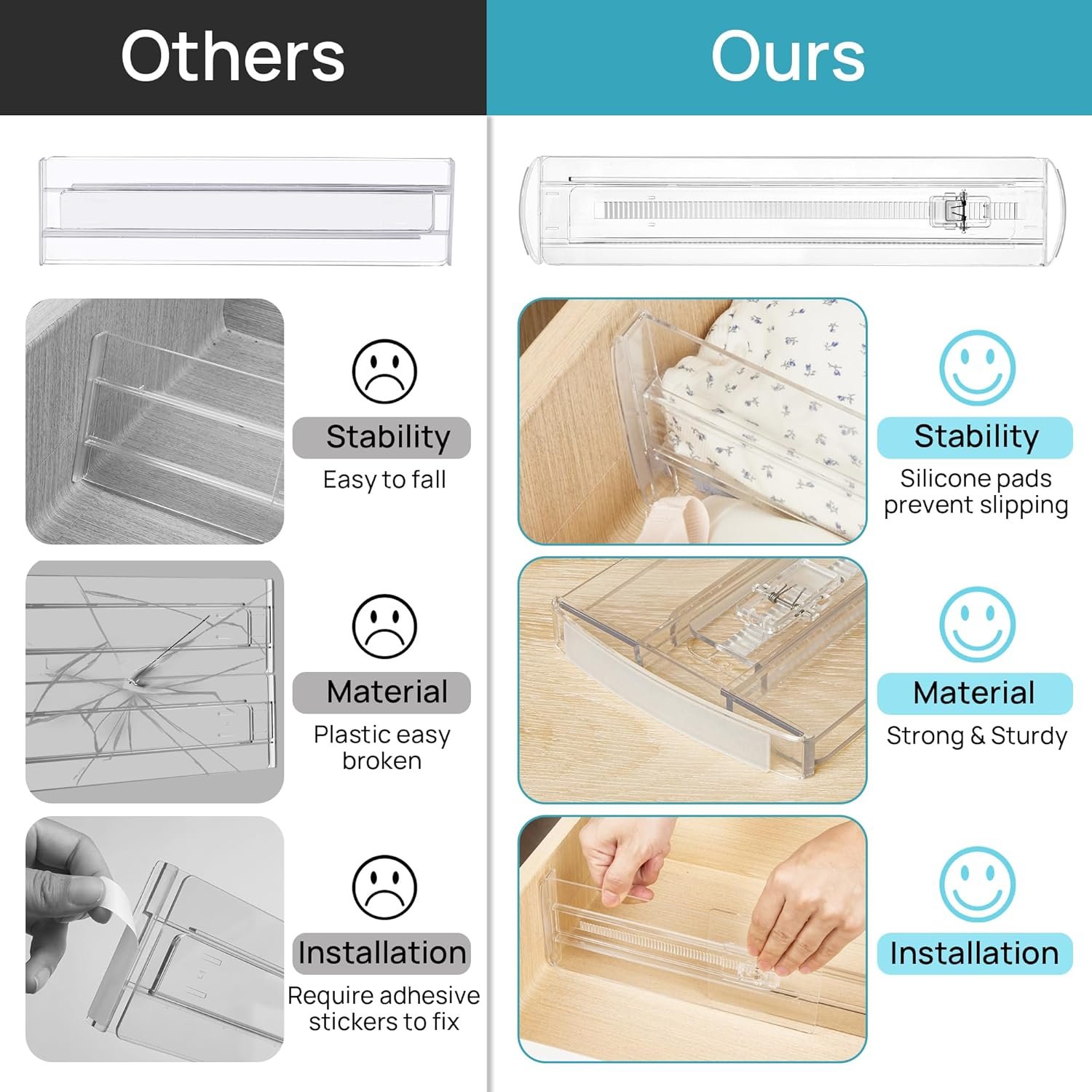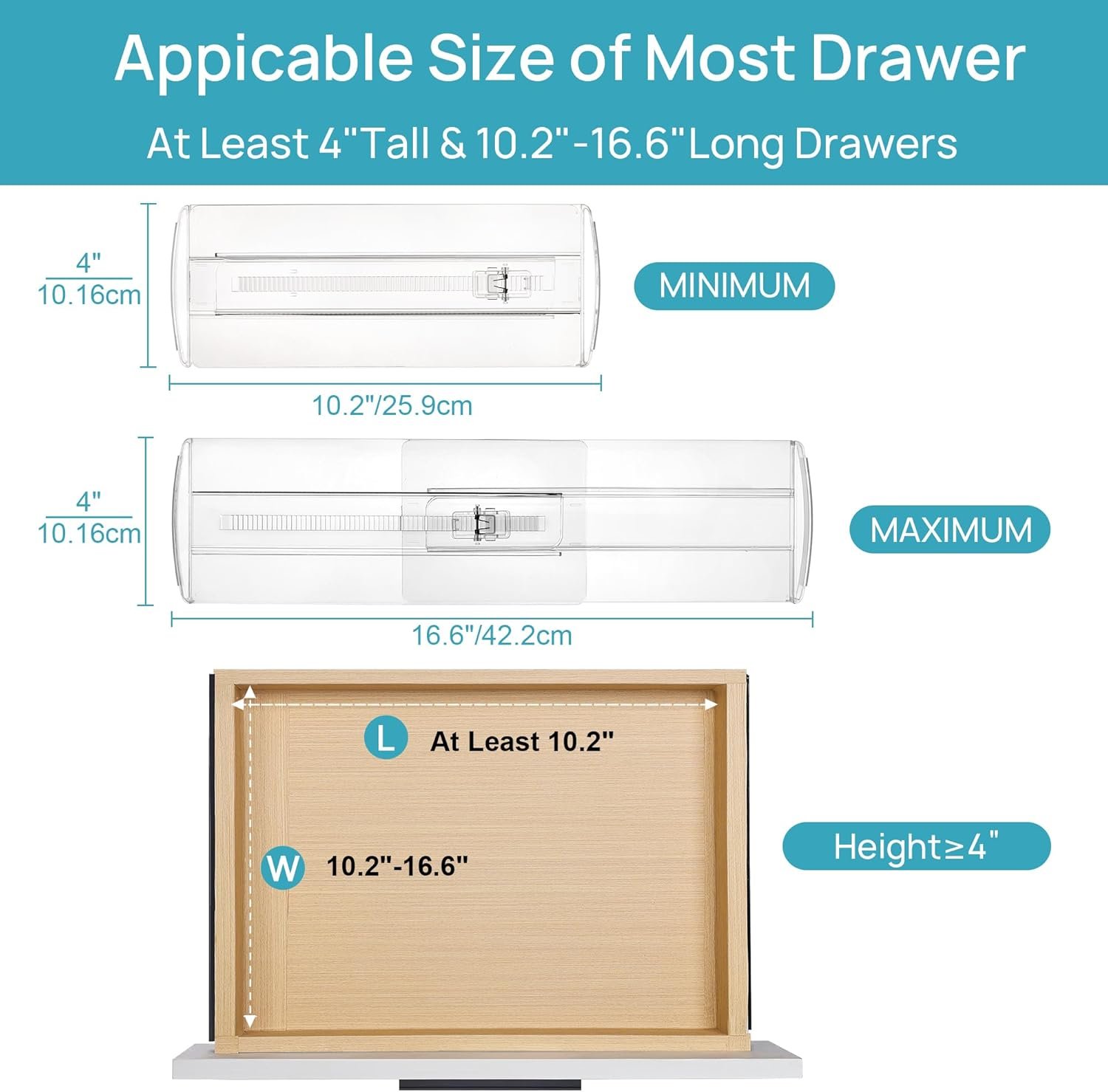 【Easy Installation & Removal】Adjust the divider to a suitable length before install, through strong spring tension and silicone friction makes drawer divider more stable. When not in use, just press the button and push back the extendable side panel. (Note: Clean the drawer before use)